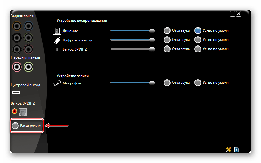 - Найдите в диспетчере Realtek справа вверху надпись: «Дополнительные настройки устройства».