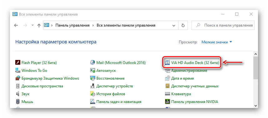 - В «Панели управления» открываем приложение VIA HD Audio Deck.
