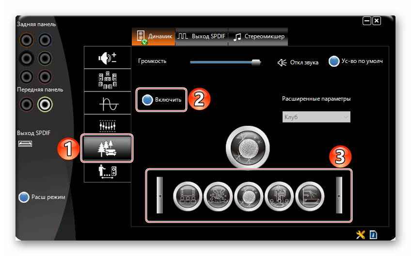 В разделе «Окружающее аудио» нажимаем «Включить» и выбираем подходящее окружение – «Театр», «Клуб», «Аудитория» и др.