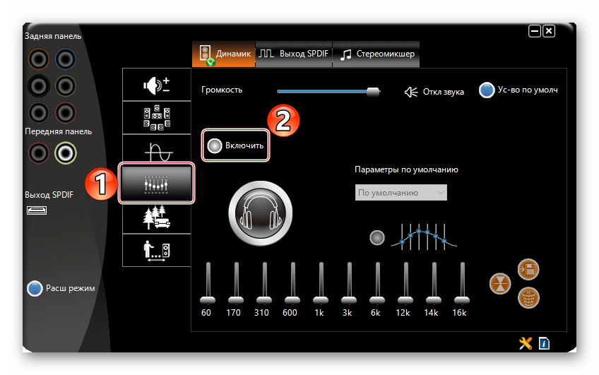 Во вкладке «Эквалайзер» нажимаем «Включить» и также настраиваем звук вручную или выбираем одну из предустановок.