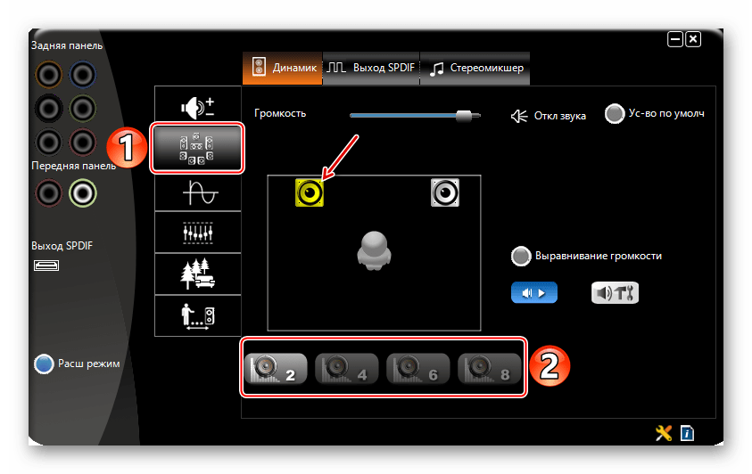Во вкладке «Параметры динамика и тест» выбираем количество колонок. Чтобы проверить звучание, щелкаем по ним мышкой.
