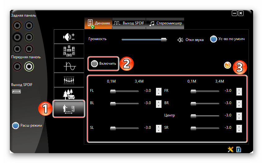 Во вкладке «Коррекция помещения» жмем «Включить» и настраиваем колонки в зависимости от особенностей помещения.