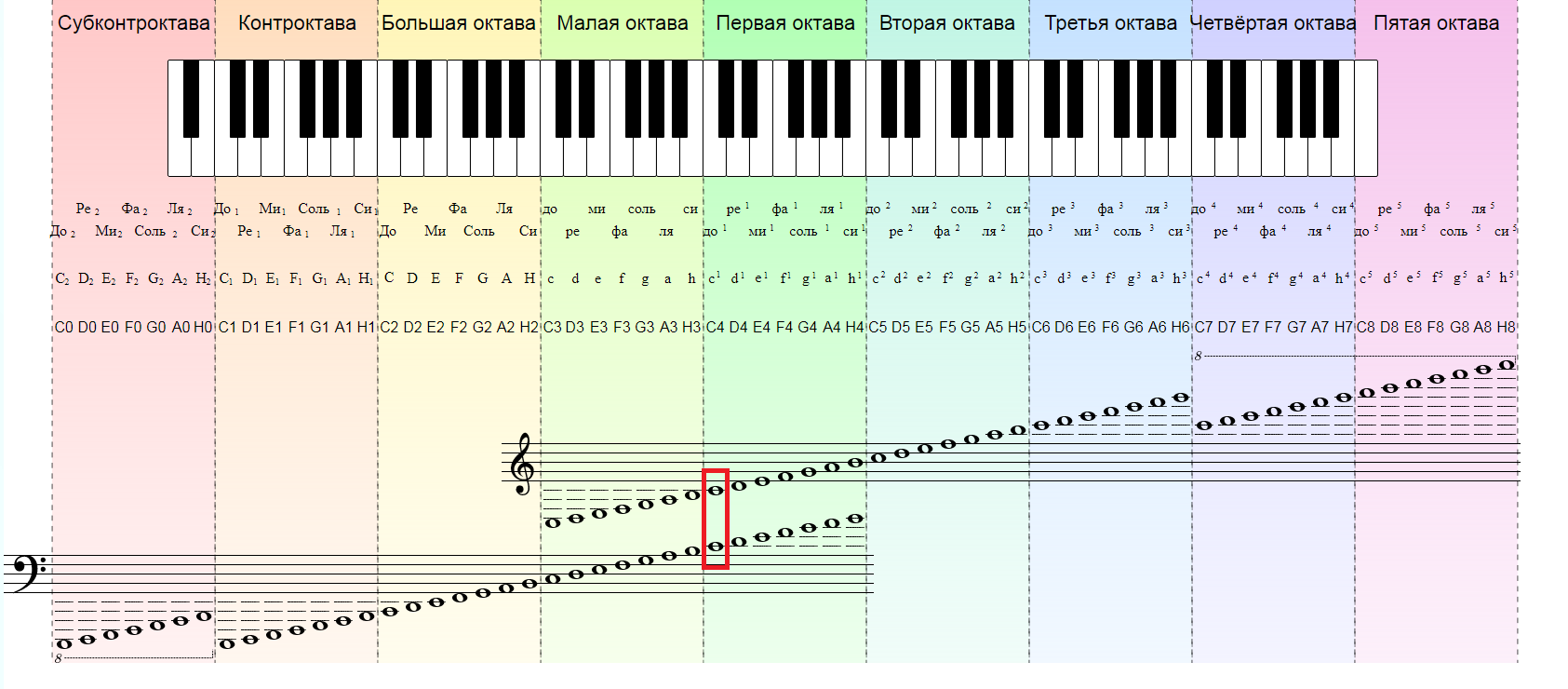 Обратите внимание, где находится первая нота «до» 1-й октавы относительно линий верхнего и нижнего нотоносца. Мы отметили ее красным цветом: