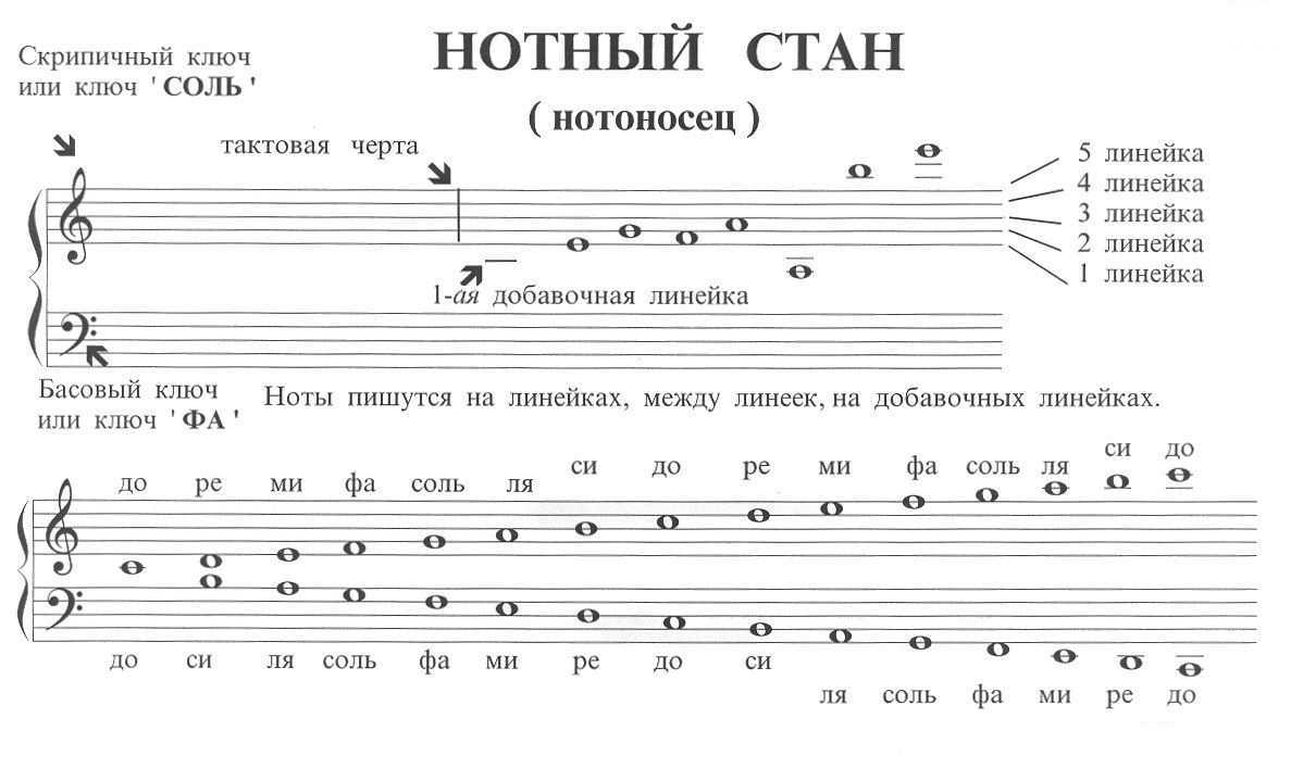Нотный стан (он же нотоносец) – это те самые 5 параллельных линий, которые вы видите на картинке. Кружочки на нотах – это условные обозначения нот. На верхнем нотоносце вы видите ноты для 1-й октавы, на нижнем – ноты для малой октавы.