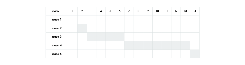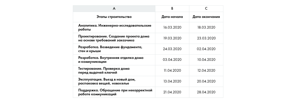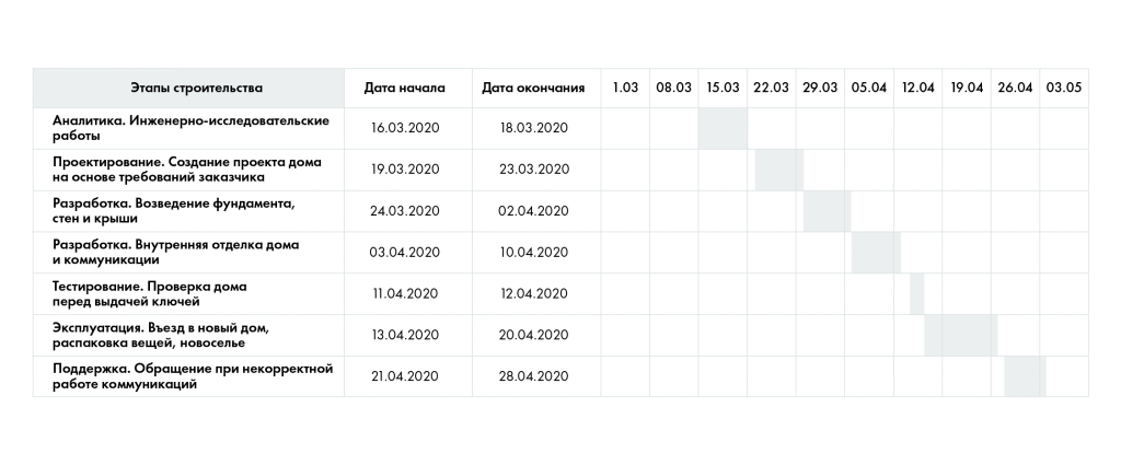 По горизонтали перечисляем этапы строительства, по вертикали указываем начало и конец каждого. Теперь диаграмма иллюстрирует принцип Waterfall: этапы идут один за другим, следующий начинается только тогда, когда заканчивается предыдущий. Это логично: невозможно возвести хороший фундамент и покрыть крышу без инженерно-исследовательских работ и четкого плана дома. Мы также видим, из каких этапов состоит проект, какие задачи входят в каждый этап и сколько времени они занимают.