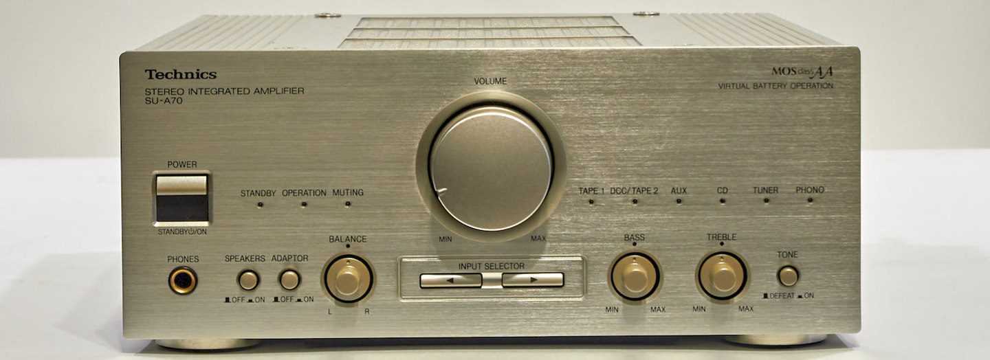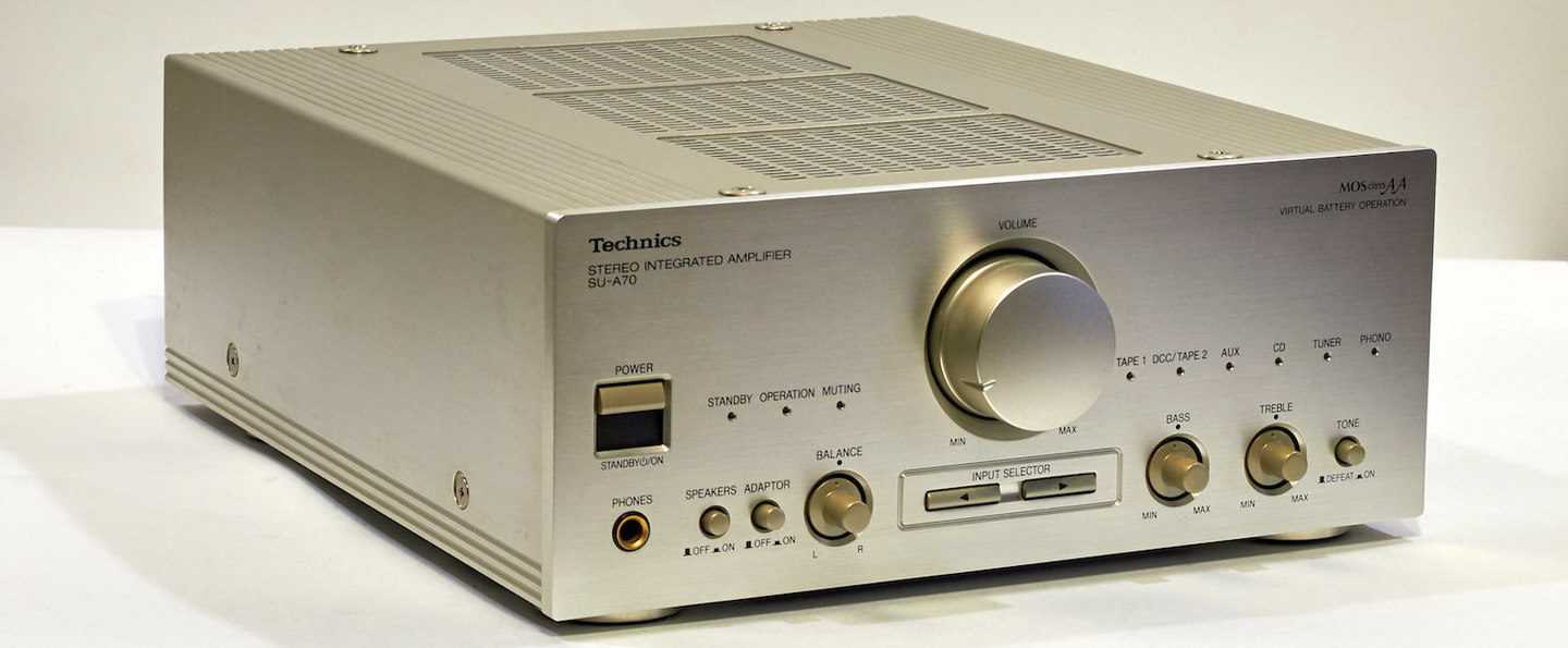 Усилитель — сердце любой аудиосистемы. В нашем случае — это Technics SU-A70. Хотя серия и вышла в середине 90-х, дизайн явно тяготеет к концу 80-х и началу 90-х годов. Рубленые формы и огромная ручка регулятора громкости, расположенная посередине лицевой панели, отсылают нас к монстрам типа Technics SU-V900 или Technics SU-MA10. Усилитель явно хочет казаться больше и круче, чем он есть. Получается, кстати, весьма неплохо! Ручка регулятора громкости выточена из алюминия, а вот остальные ручки пластиковые — на них решили сэкономить.