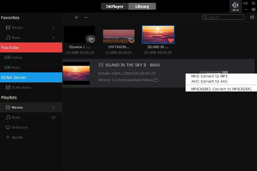 Знакомясь с функционалом плеера более основательно, можно обнаружить для себя неочевидные функции. Например, если нажать маленькую импровизированную стрелку в правом верхнем углу рабочего окна, откроется скромное текстовое меню, позволяющее выбрать файл для воспроизведения или перейти в настройки плеера. А еще с помощью 5KPlayer вы можете сконвертировать видео в аудио MP3, AAC и MP4. Зайдя в плейлисты и кликнув по добавленному видеофайлу, вы увидите на открывшейся панельке кнопку «Convert», нажатие которой вызовет меню доступных форматов и кодеков.