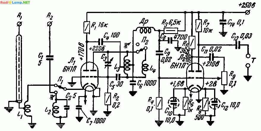 Усилитель высокой частоты собран на левом (по схеме) триоде лампы Л по схеме с заземленной сеткой. В этой схеме емкость между катодом и анодом лампы мала, что позволяет получить заметное усиление сигнала на высоких частотах.