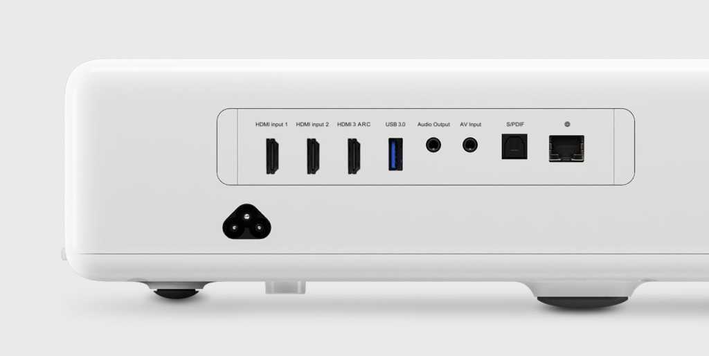 В задней части проектора расположены три порта HDMI 2.0, один из них поддерживает ARC — порт можно использовать и как вход, и как аудиовыход.Также имеется порт USB 3.0 и аудиовыход, вход AV, порт S/PDIF и разъем Ethernet. Дополнительный порт USB 2.0 расположен сбоку устройства.