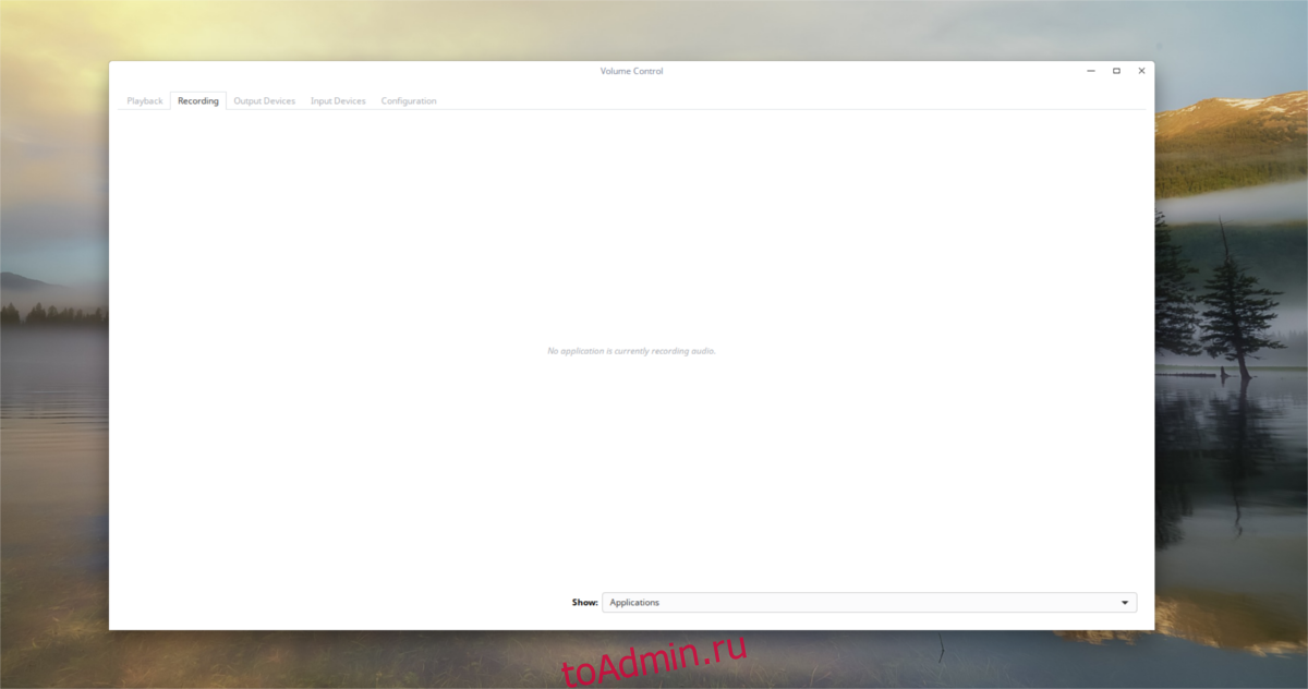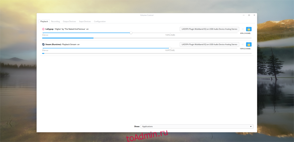 Внутри Pavucontrol есть пять вкладок; «Воспроизведение», «запись», «устройства вывода», «устройства ввода» и «конфигурация». Для начала, вкладка воспроизведения представляет любую программу, в настоящее время использующую звуковую систему Pulse. На этой вкладке регулируйте громкость воспроизведения каждой программы.