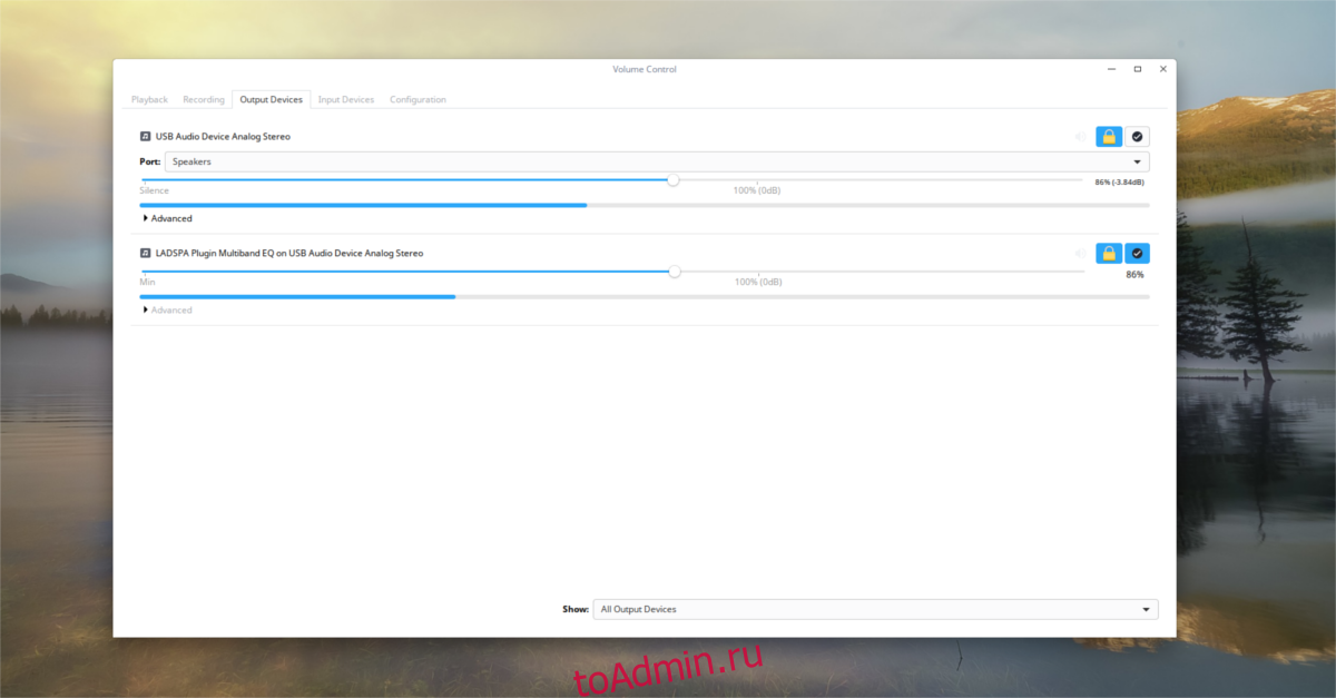 Вкладка «вывод» аналогична вкладке «ввод». Как и секция ввода, вывод позволяет пользователю легко управлять громкостью воспроизводящих устройств индивидуально.
