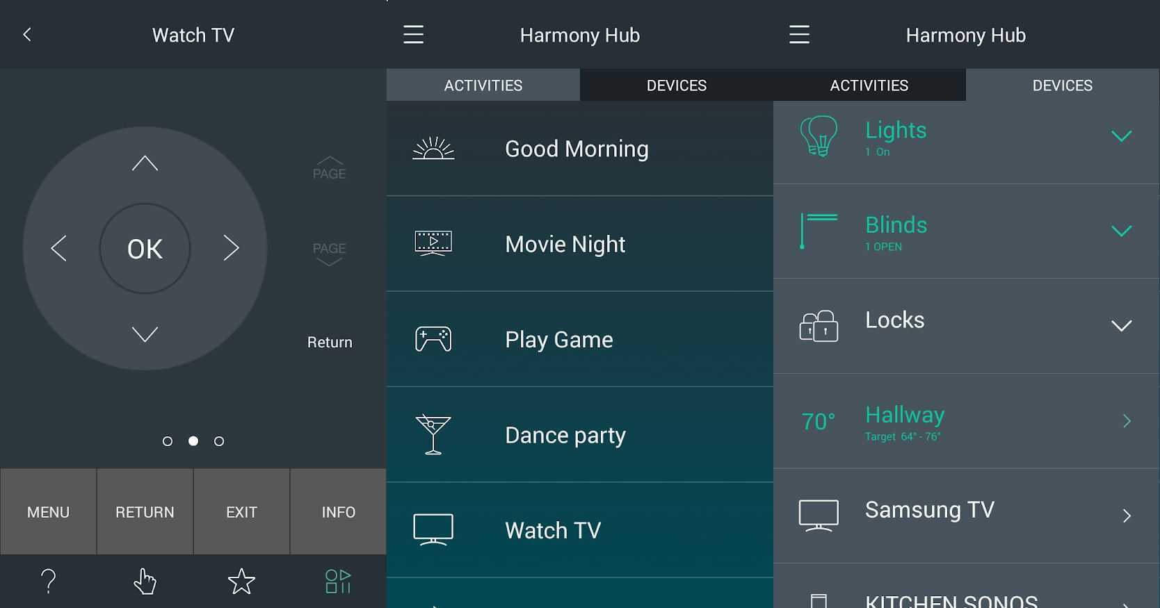 Logitech сочетает в себе оборудование для управления ИК и WiFi с приложениями для iOS и Android, которые позволяют совместимому смартфону управлять несколькими компонентами домашнего кинотеатра, а также другими устройствами для умного дома, такими как лампы, термостаты и замки. Устройства могут управляться индивидуально или объединяться в «действия». Например, вы можете запрограммировать приложение на «Смотреть телевизор». Работая с совместимыми продуктами Harmony Remote, он включит телевизор и проигрыватель дисков Blu-ray, выключит свет и закроет жалюзи.