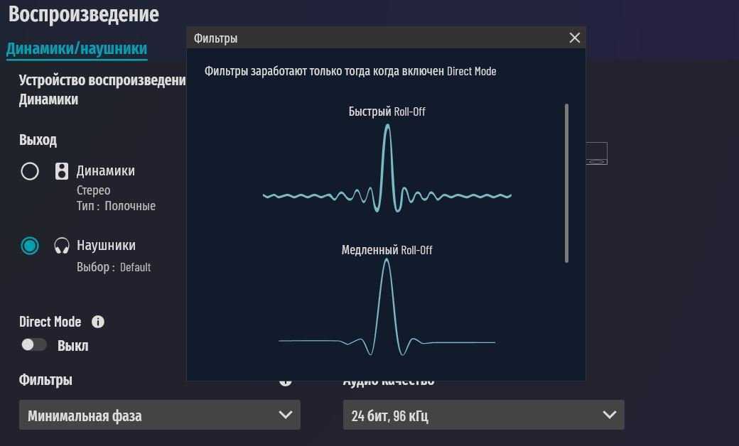 На этой же вкладке включается режим Direct Mode – он отключает все настройки и передает звук без обработки. Для данного режима имеются три фильтра Roll-off. Сдвиг фазы не все расслышат, но можно послушать и выставить то, что вам больше симпатично.