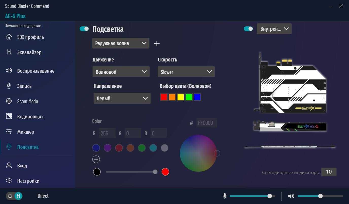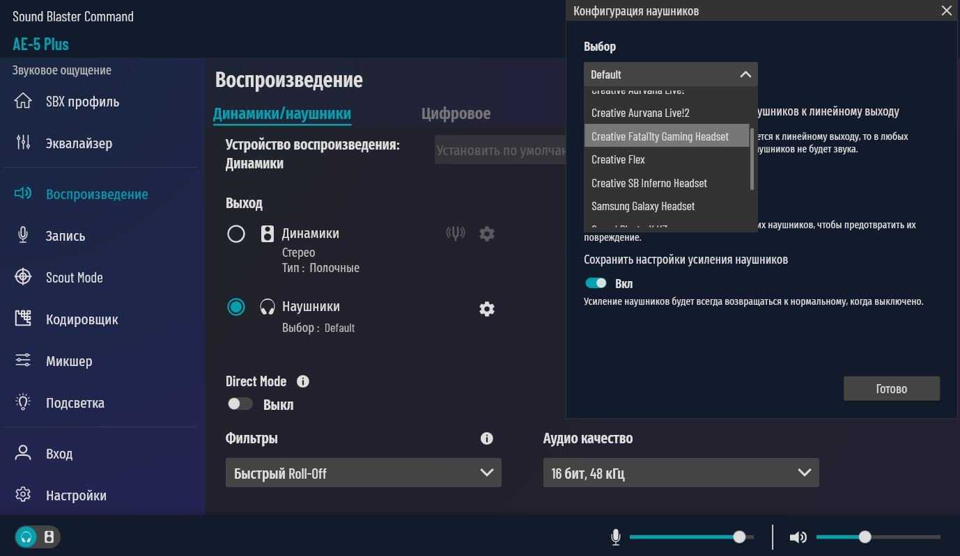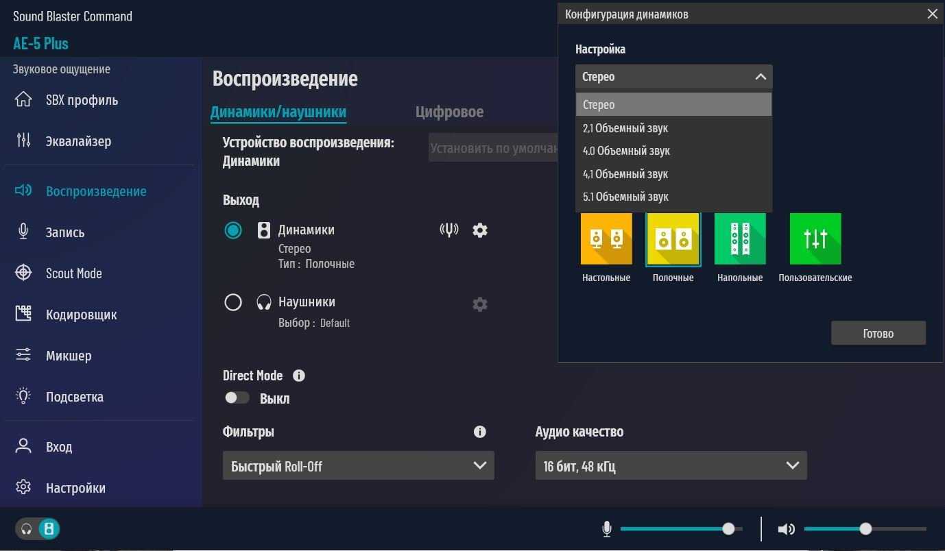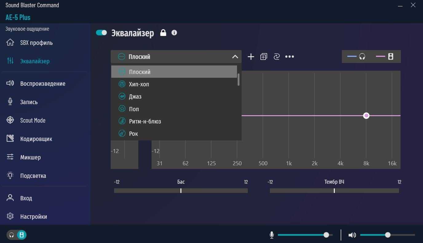 Для динамиков выбор от стерео до 5.1 системы. Для наушников также можно включить объемный звук до 7.1 системы. Возможен выбор конфигурации наушников по списку из основных моделей Creative, Apple и Samsung. Здесь же переключаем импеданс наушников.