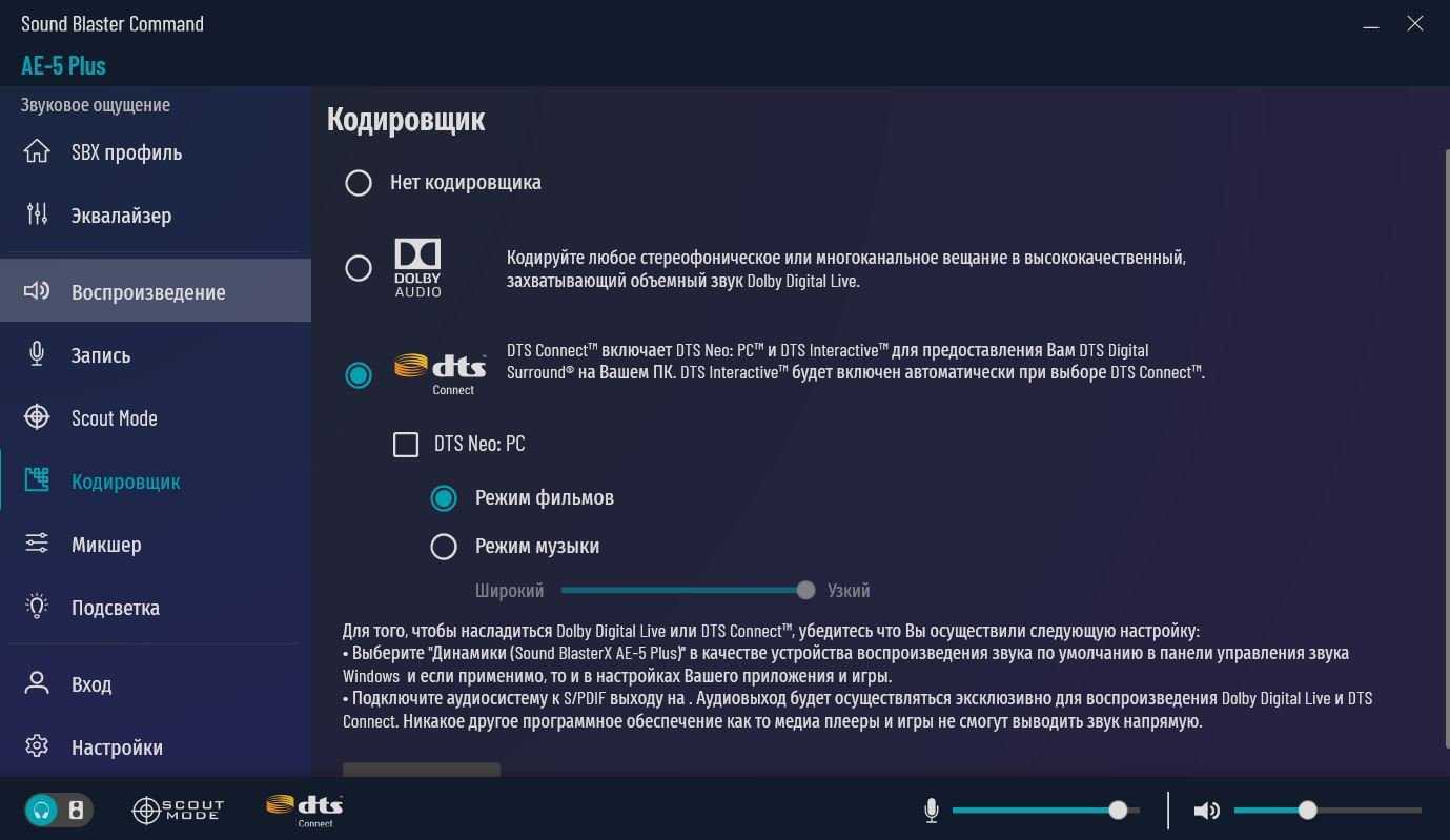 Кодировщик: преобразует стереозвук в объемный Dolby Digital или DTS.