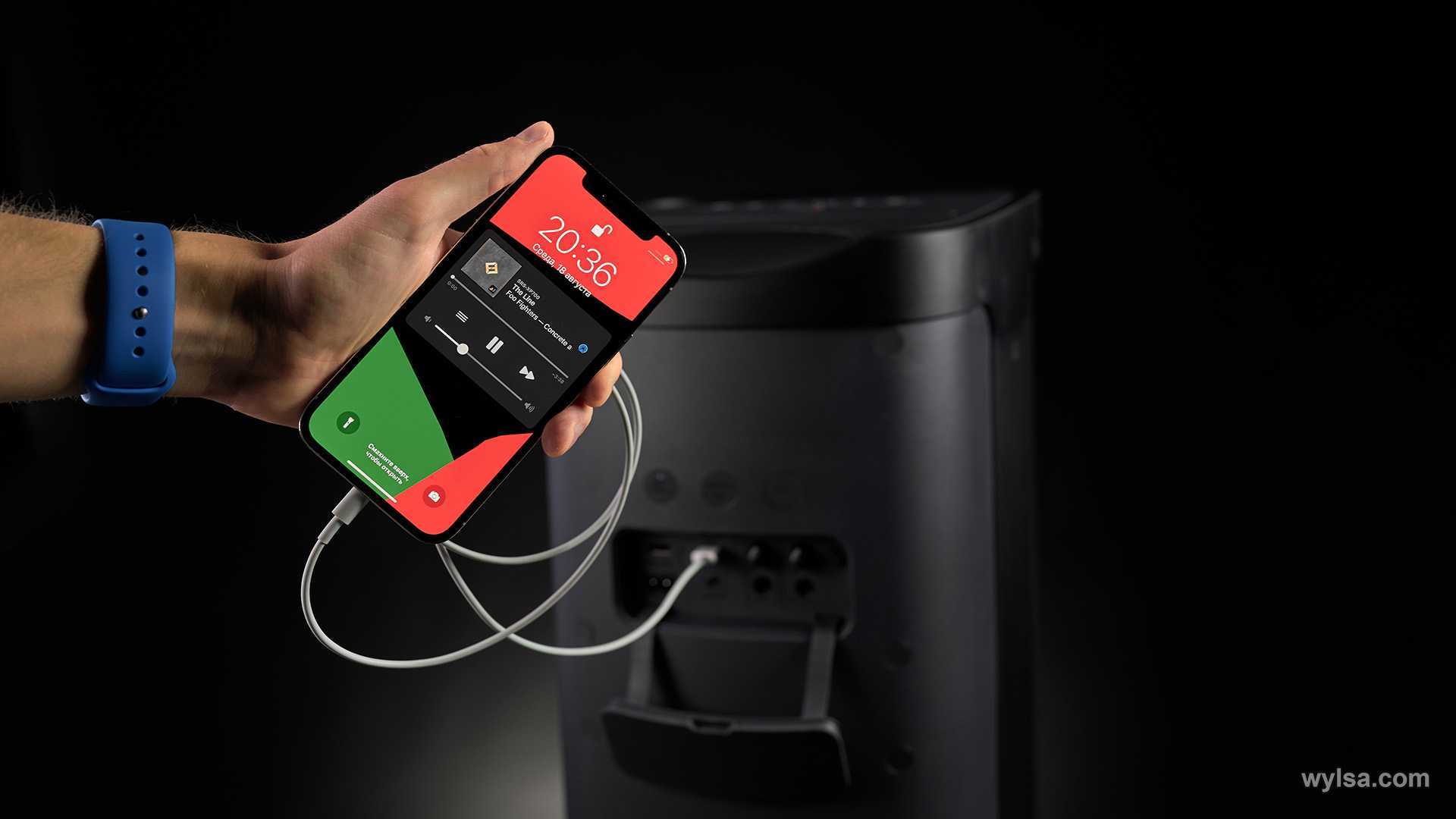 Подсветка отключаемая, кнопка как раз над панелью с разъёмами. Вообще, для нормального управления устройством вам нужно поставить две утилиты: Sony Music Center и Fiestable. В первой всё связанное с обновлениями, эквалайзерами, во второй всё про свет, караоке и развлекательные функции. Советую поставить обе утилиты хотя бы для баловства, ну а потом решите, нужны они вам или нет. Естественно, они существуют и для iPhone, и для Android.