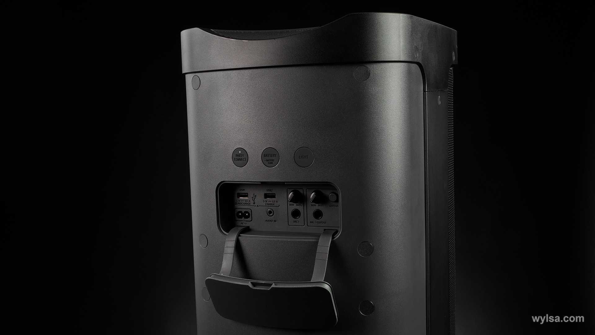 Ещё сзади есть кнопка Party Connect, в цепь можно подключить сто колонок Sony. Поддержка функции точно есть у новинок этого года, акустических систем SRS-XP700, SRS-XP500, SRS-XG500.