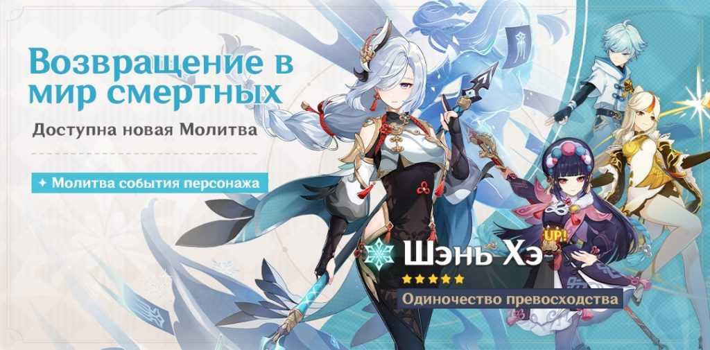 В этом обновлении доступна две молитвы — Возвращение в мир смертных с новым 5-звездочным персонажем Шэнь Хэ и новым 4-звездочным персонажем Юнь Цзинь, и Приглашение к мирской жизни с повторным баннером Сяо.