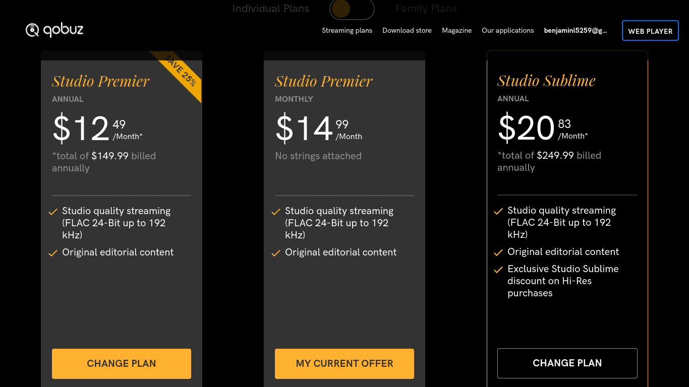 Хорошая сторона Qobuz заключается в том, что он предоставляет одинаковые параметры качества звука для всех премиум-пользователей, независимо от того, на каком тарифном плане они находятся. Вот планы, доступные в настоящее время на Qobuz, и то, что они включают (всегда проверяйте страницу с ценами Qobuz для получения обновленной информации о ценах):