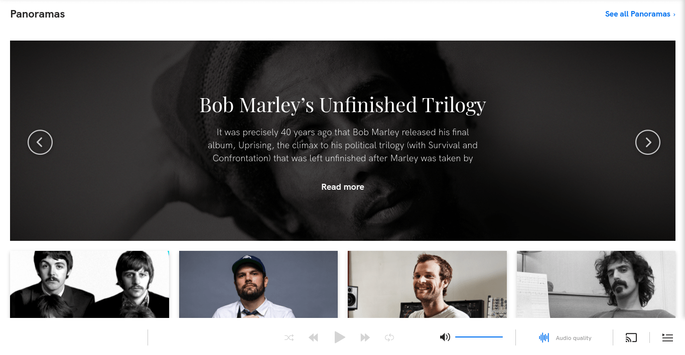 Под областью плейлистов находятся «Панорамы» и «Новости». Панорамы — это в основном интересные обзоры исполнителей и другие темы, связанные с музыкой, в то время как Новости освещают новостные статьи, связанные с музыкальной индустрией.