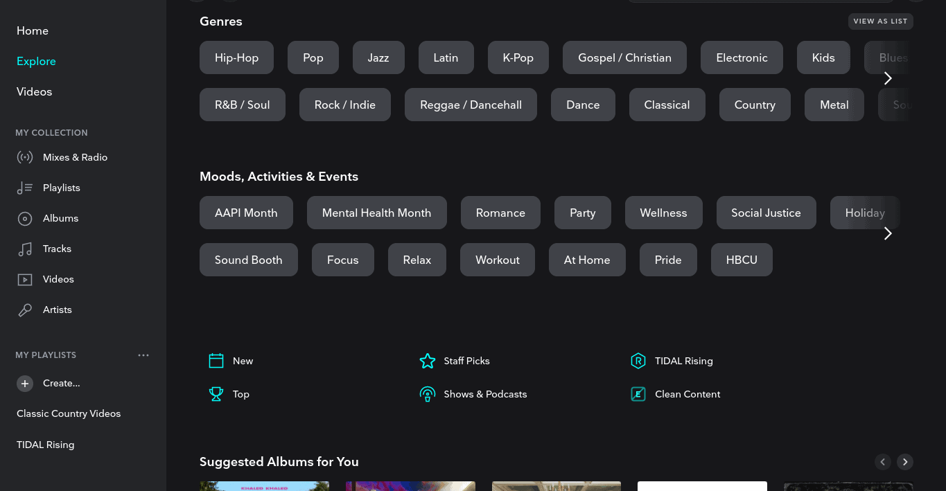В разделе «Что нового» содержится тщательно подобранный контент, такой как альбомы, плейлисты, видео и подкасты, а в Tidal Rising рекламируются интересные перспективные исполнители