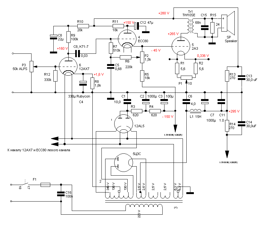 В литературе имеется множество публикаций на эту тему и это вдохновило меня сделать для дома небольшой по мощности но простенький усилитель на всем хорошо известной лампе 6С4С. Я заказал в фирме “Аудиоинструмент” сетевик и пару выходных трансов TW10SE. В начальном варианте я использовал 6Н2П ( вместо 12АХ7 ), 6Н1П ( вместо ЕСС80 ), 6Х2П ( вместо 12AL5 ) – так что те, у кого нет указанных в схеме ламп, могут смело ставить отечественные ( переделав только напряжение накала с 12,6 на 6,3 В ).
