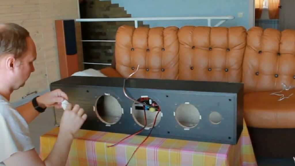 Теперь начнем сборку акустики. Устанавливаем новые кроссоверы на своё место. Проклеиваем синтипоном всю колонку внутри. Всё по старой, отработанной схеме.