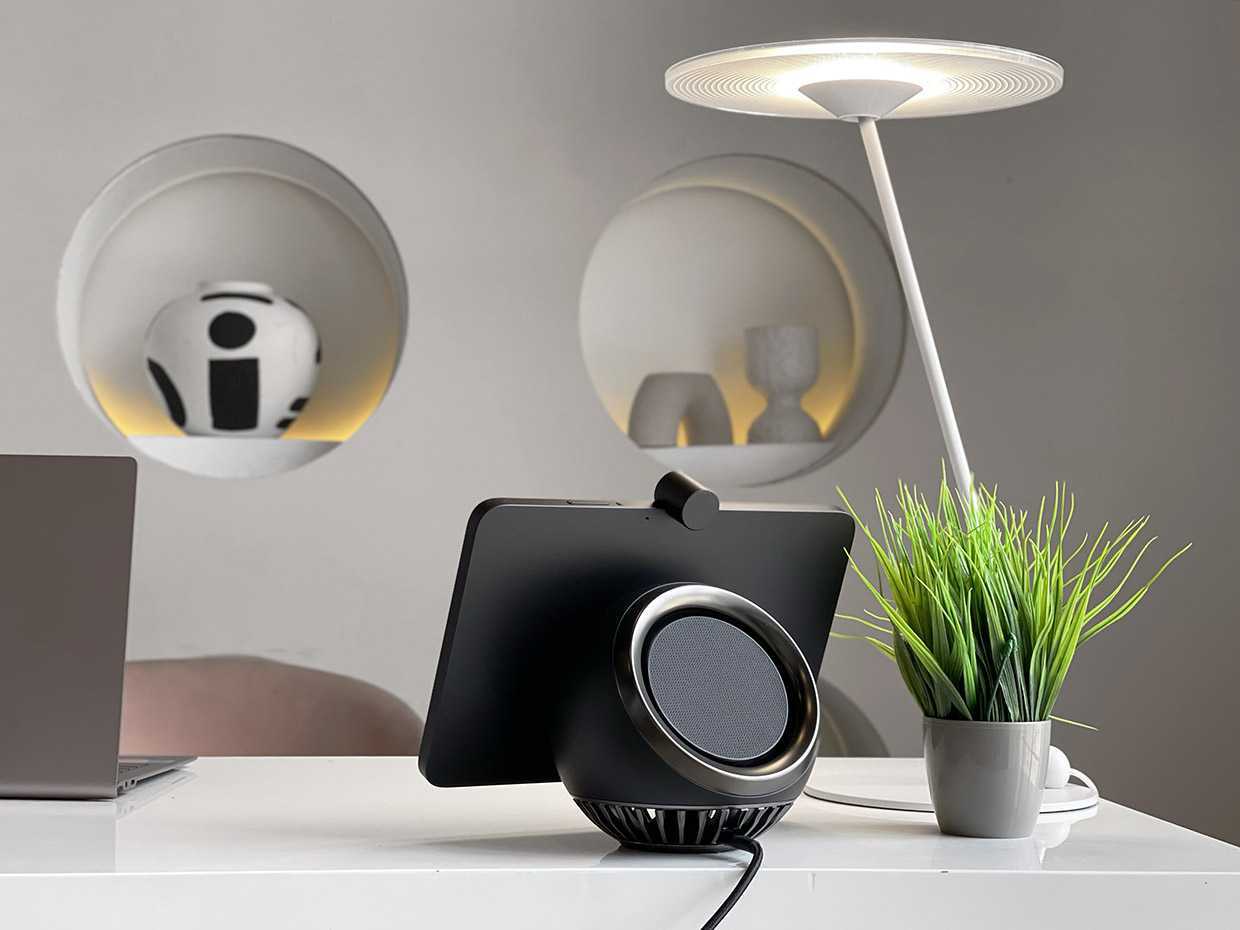 Благодаря грамотному дизайнерскому решению создаётся впечатление, будто экран парит в воздухе, а не стоит на динамике. Последний вообще не видно за экраном. При этом он слегка приподнят, что упрощает взаимодействие с устройством, да и в него просто банально удобно смотреть под углом.
