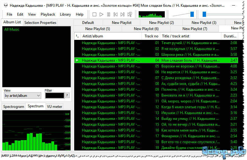 Плейлист foobar2000 имеет вид колонок, в каждой выводится заданная информация. Также плейлист может объединять треки в группы исходя из определённых признаков и характеристик, будь то альбом или исполнитель, жанр и пр. По умолчанию здесь даётся определенный набор колонок и групп, но позволяется добавлять свои. В частности, если вы слушаете музыку по альбомам, и вам нравится получать различную дополнительную информацию, например, год выпуска, издатель, рейтинг, можно использовать группировку по альбомам или какие-либо свои колонки.