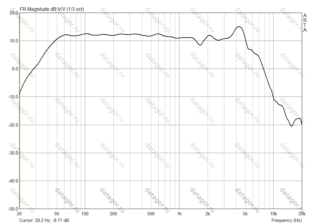 Замер в упор доработанного динамика 25ГДН-3-4, порт ФИ заткнут. Видно, что по уровню -3 дБ нижняя частота 45 Гц. Частоту по -15 дБ, как принято измерять у промышленных колонок, найдите по графику сами. После включения и настройки ФИ удалось понизить частоту, но привести график измерений затруднительно из-за удаленности отверстия ФИ от динамика.