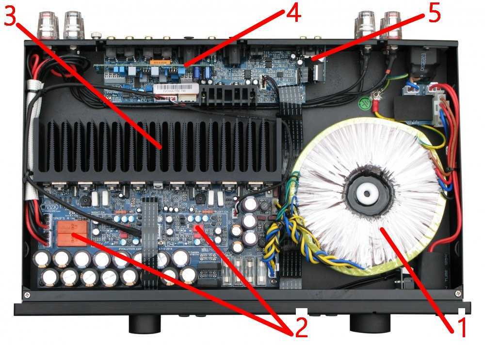 Комплиментарные пары транзисторов SRD03P/STD03N (по два на канал) смонтированы на радиаторе охлаждения, который отделяет секции усилителя мощности и предусилителя друг от друга (3). Большой коэффициент усиления достигнут за счет схемы Дарлингтона (одна пара выходных транзисторов открыта только в режиме больших токов). На плате УМ много высококачественных пленочных конденсаторов WIMA (2). Коммутация входов на плате предусилителя осуществляется через реле, а регулировка уровня резистивной матрицей JRC. Балансный сигнал со входа XLR преобразуется в несимметричный с помощью микросхемы JRC5840. На плате ПУ предусмотрено место под модуль фонокорректора Sequel2 (4). Отдельная платка линейного входа №5 (5) может быть заменена на плату ЦАПа Ruby или плату радиотюнера Ambit. Телефонный усилитель не просто снимает сигнал с выхода усилителя мощности, а представляет собой выделенную схему на плате ПУ. 300-ваттный тороидальный трансформатор (1) питает схемы стабилизации на плате УМ и на плате ПУ.