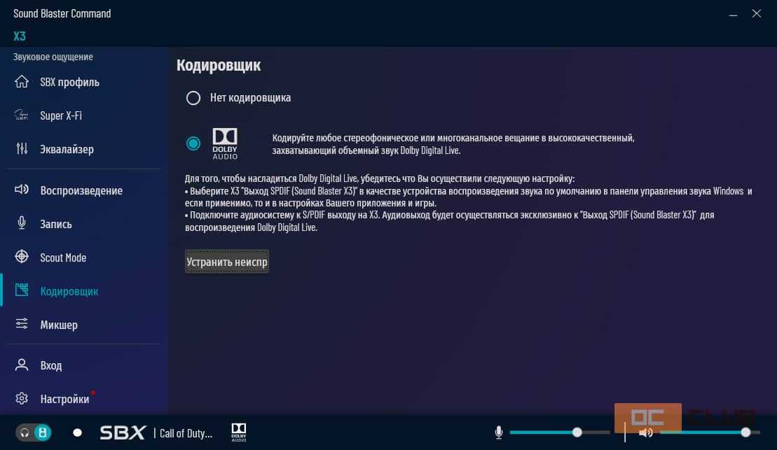 Третье из любопытного – вкладка кодировщик. Он предназначен для кодирования любого стерео-звука в объёмный. Работает только при подключении акустики через оптический S/PDIF.
