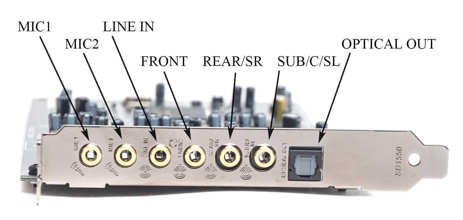 | Разъемы на карте | Аналого-цифровой выход (центр+сабвуфер/6-канальный выход SPDIF), линейный вход, вход микрофона, линейный выход (фронт)/наушники, линейный выход (тыл), SB1394, вход телефона (для функции автоответчика), аналоговый вход CD Audio, цифровой вход CD Audio |