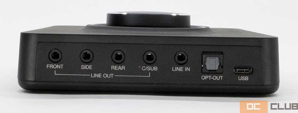 С противоположной – набор 3,5-мм портов. Есть 4 выхода, один вход, а также оптический S/PDIF. Рядом виден разъём USB Type-C для подключения к источнику звука. Для организации системы 2.0 или 2.1 достаточно будет разъёма Front, а 5.1 или 7.1 уже задействуют весь квартет портов.